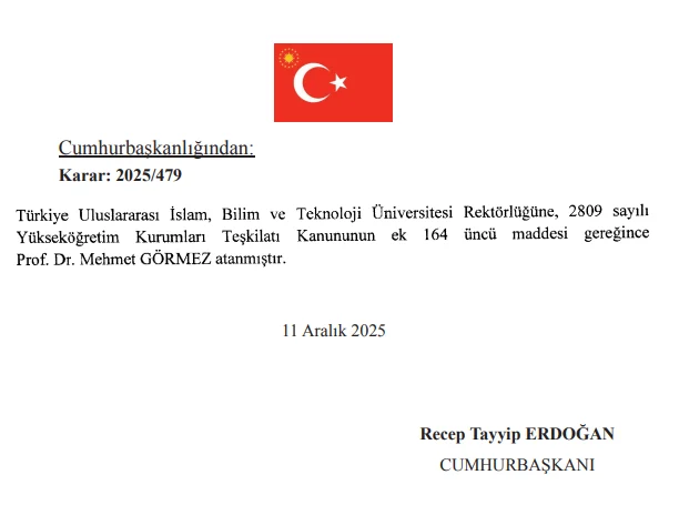 – Türkiye Uluslararası İslam, Bilim ve Teknoloji Üniversitesi Rektörlüğüne Prof. Dr. Mehmet Görmez,