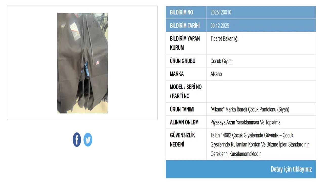 “Alkano” markasına ait bir çocuk pantolonu, bel kısmındaki kordonların standardın gereklerini karşılamaması nedeniyle güvensiz bulundu. Söz konusu ürünün çocuklar için “yaralanma riski” taşıdığı ifade edildi.
